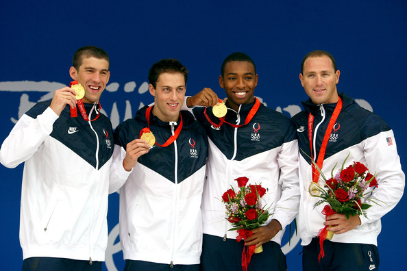 Here is the famous photo of Phelps celebrating after that relay win, plus the full squad below (Lezak is on the far right):