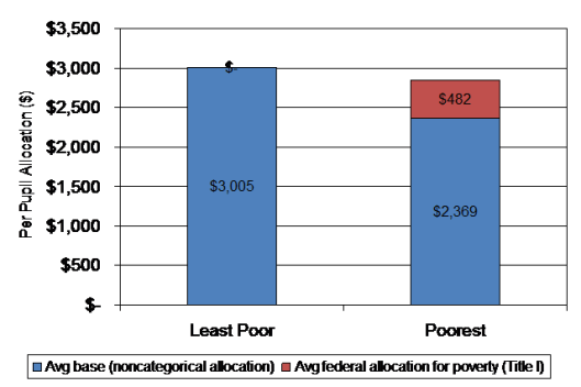 The funding gap between schools with wealthy and poor student populations is so large that Title I dollars cannot make up for it — instead of providing a boost, it can’t even provide a level playing field. So the highest poverty schools actually receive less than wealthier schools — completely opposite of what is intended.